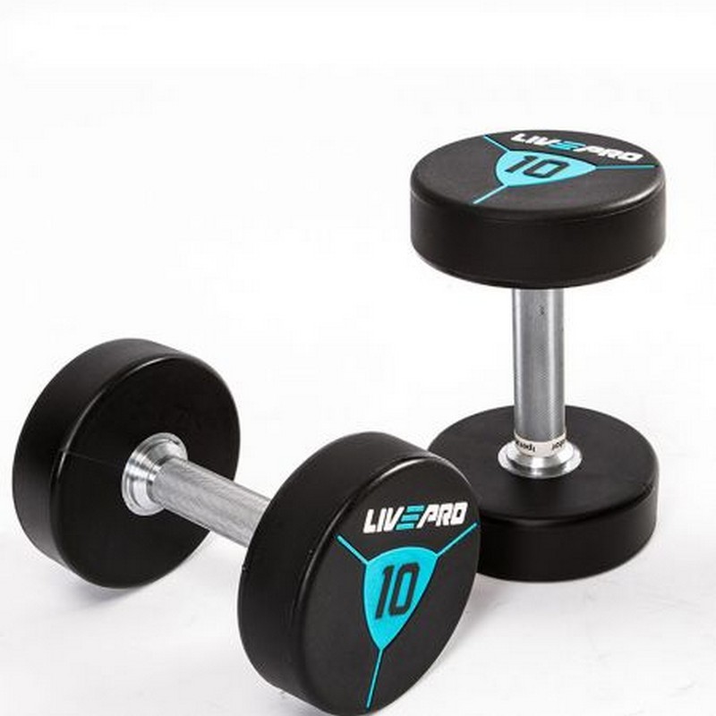 ОСНОВНАЯ ИНФОРМАЦИЯ Гантели в уретане LIVEPRO Premium Urethane Dumbbells - это идеальные гантели для оснащения фитнес-залов. Они хорошо сбалансированы, весовые диски покрыты прочным уретановым покрытием, что защищает их от повреждений. Насечки на ручке обеспечивают хороший хват при выполнении упражнений, а яркая маркировка веса позволяет легко выбирать необходимую нагрузку для каждого упражнения. Преимущества: Уретановое покрытие гантелей позволяет им сохранять отличный вид даже в залах с повышенной проходимостью Гантели доступны в весах от 2 до 50 килограммов с шагом 2 килограмма Удобные насечки на ручках гантелей обеспечивают хороший хват Маркировка на боковых сторонах гантелей позволяет быстро находить необходимый вес