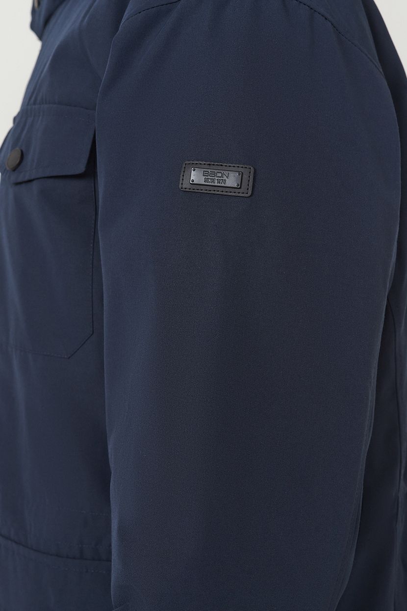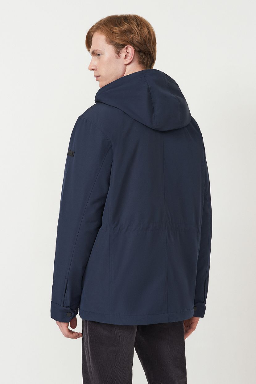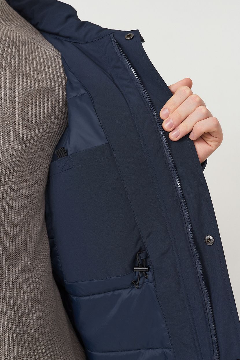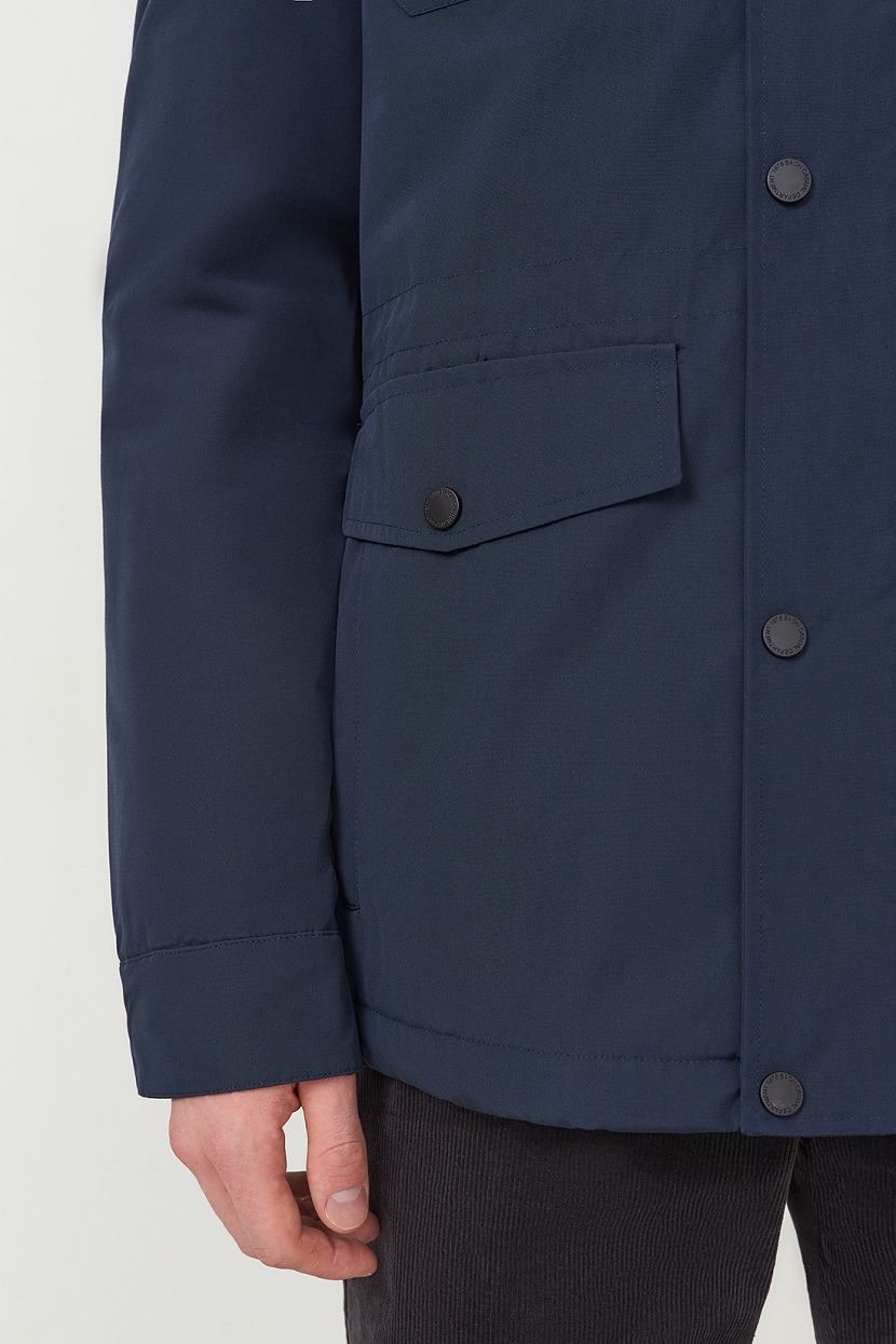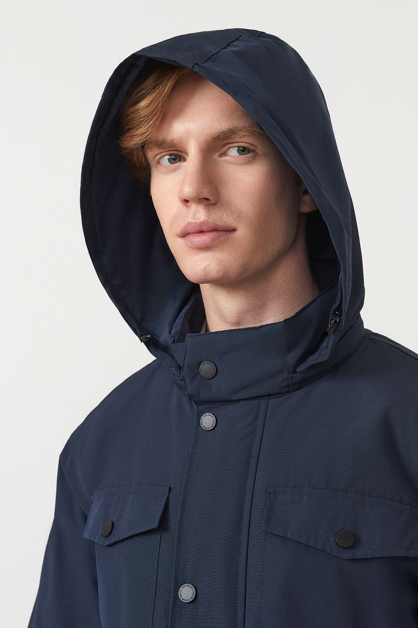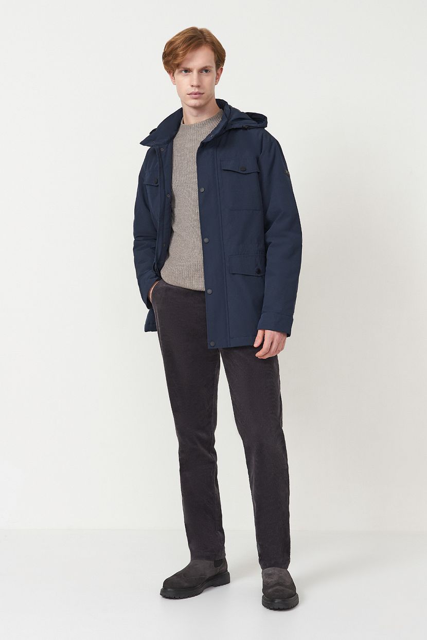Удлиненная мужская куртка-парка со съемным капюшоном выполнена из фактурной ткани с защитными пропитками и утеплена конжугейтом. Модель прямого кроя с воротником-стойкой. Куртка застегивается на молнию с ветрозащитным клапаном на кнопках. На передней полочке расположены две пары карманов, которые закрываются клапанами на кнопках. Дополнительные карманы расположены на внутренней полочке изделия. Втачные рукава с манжетами из плотного трикотажа в рубчик. Куртка имеет внутреннюю регулировку на кулиске по талии. Рекомендованный температурный режим носки до -5 градусов.Мужская парка изготовлена из структурной ткани с содержанием хлопка. Материал обработан водоотталкивающей пропиткой WR, благодаря которой капли мокрых осадков скатываются с поверхности, а не впитываются в нее. Пропитка CIRE препятствует миграции утеплителя. Полиэстер в составе ткани гарантирует прочность и износостойкость изделия, хлопок – регулирует теплообмен и отводит влагу на поверхность, где она испаряется.